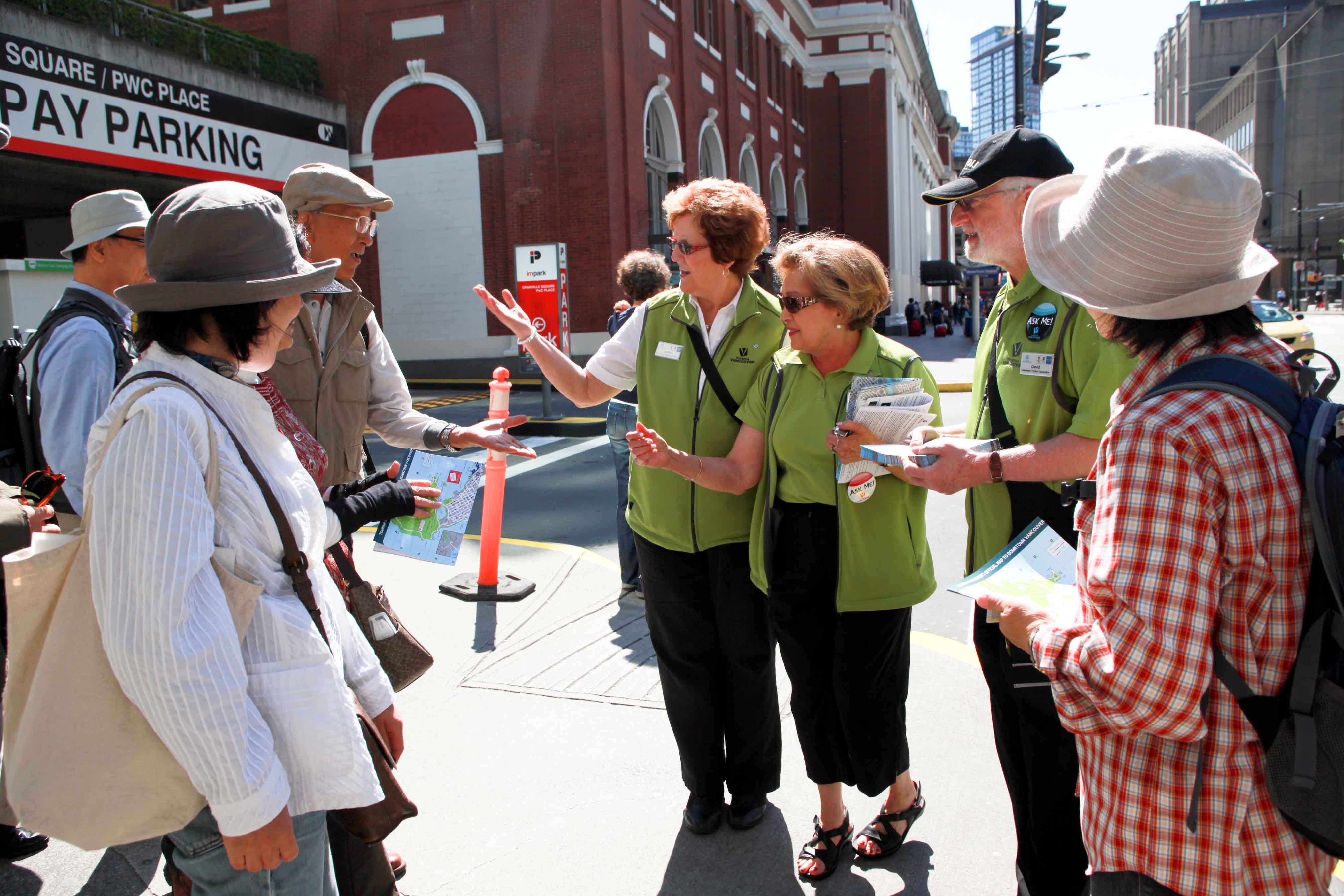 途中、ダウンタウンで観光客のお手伝いをするボランティアの皆さんを見かけましたので、お声をかけました。宿題(カナダ人にバンクーバーのおすすめの場所を聞いてみる)のいいチャンスだったのですが、突然の出来事に・・・でも楽しいひと時でしたね。