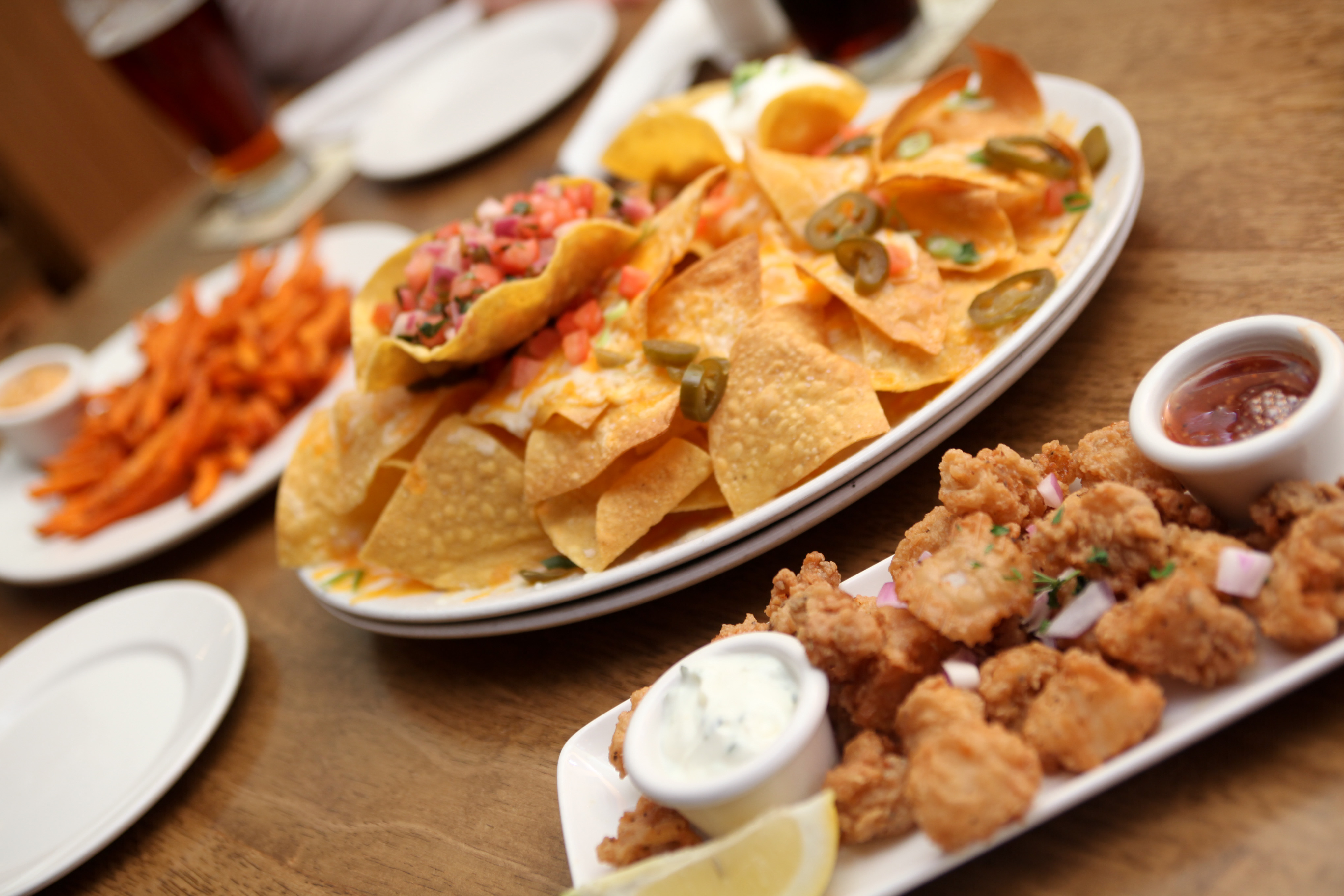 奥より、ヤムフライ(さつまいもに似ています)、ナチョス(チップにチーズなどをかけ焼いたもの)、お客様もだいぶ気にいってくださったカラマリ(イカのフライ)です。