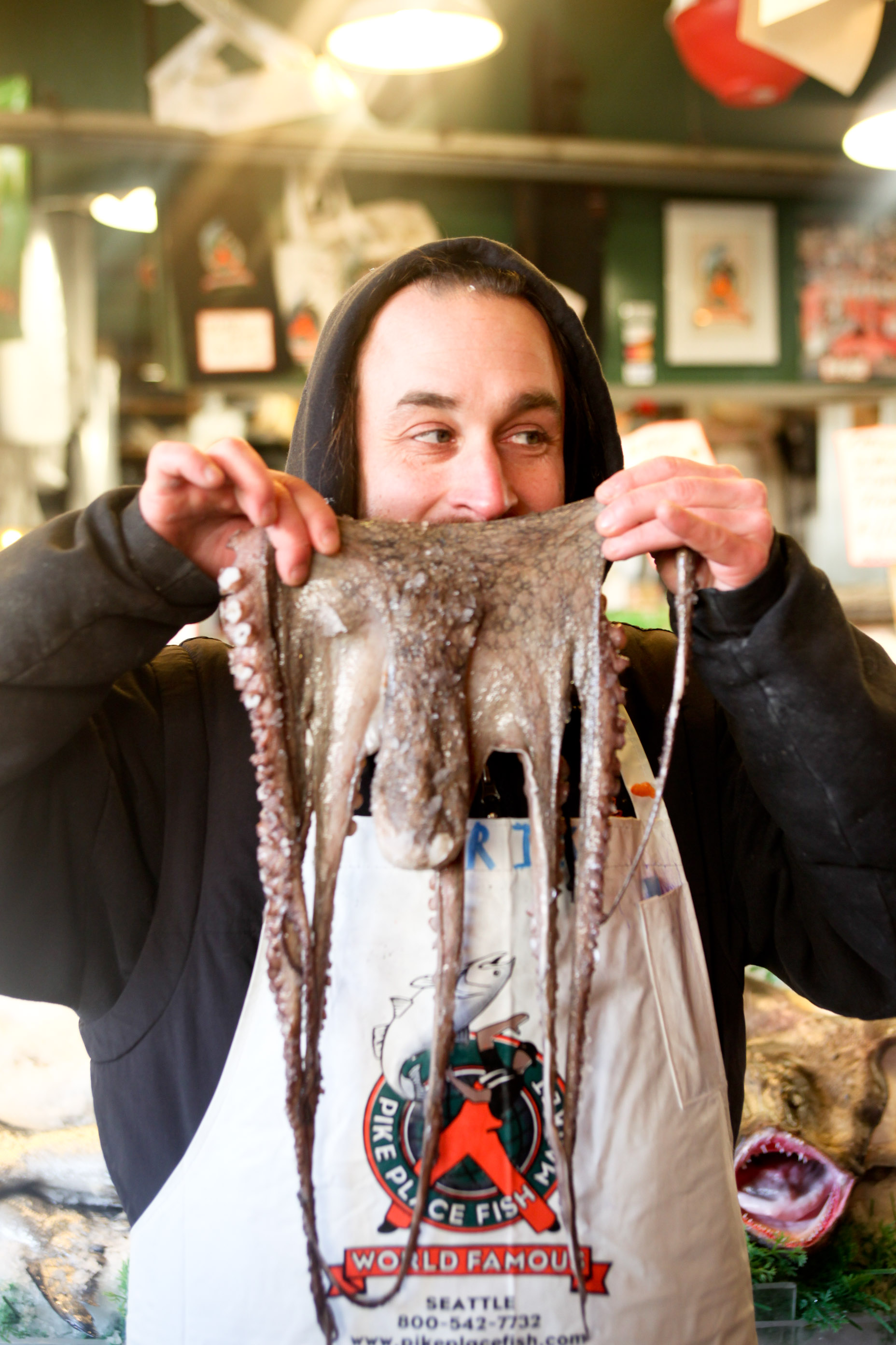 そしてお決まりですが、お魚やさんへ。おちゃめなおにいさんが蛸を!